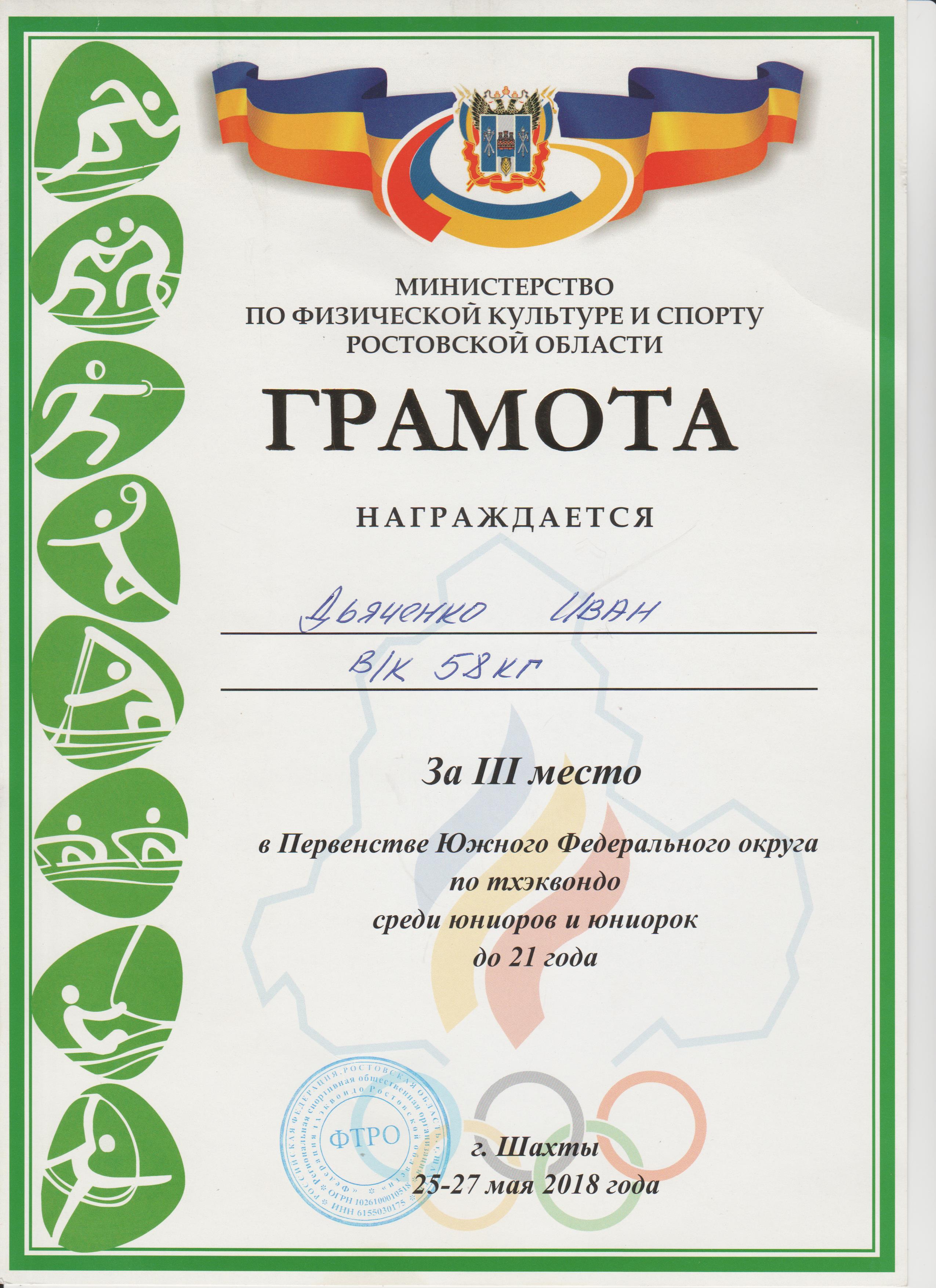 Иван занимается тхэквандо с 2013 года в Шахтинском Дворце спорта, тренер Смирнов А.А.